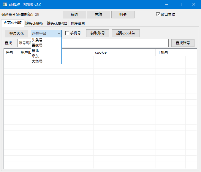 火花提取-可免客户端(支持头条) 登录账号-获取账号-勾选要提取的账号(右键功能) -提取cookie - 右键导出