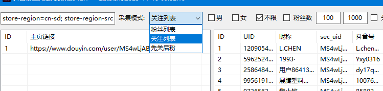 2.在软件中左侧列表中,右键粘贴,或将用户主页整理到txt中导入均可,在左侧顶部填入抖音cookie(建议使用小号),设置选项即可开始采集